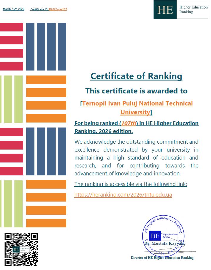 Тернопільський національний технічний університет імені Івана Пулюя увійшов до міжнародного рейтингу "HE Higher Education Ranking 2026". Наш університет посів #107 місце серед 507 університетів світу та увійшов до #топ 8 закладів вищої освіти України.