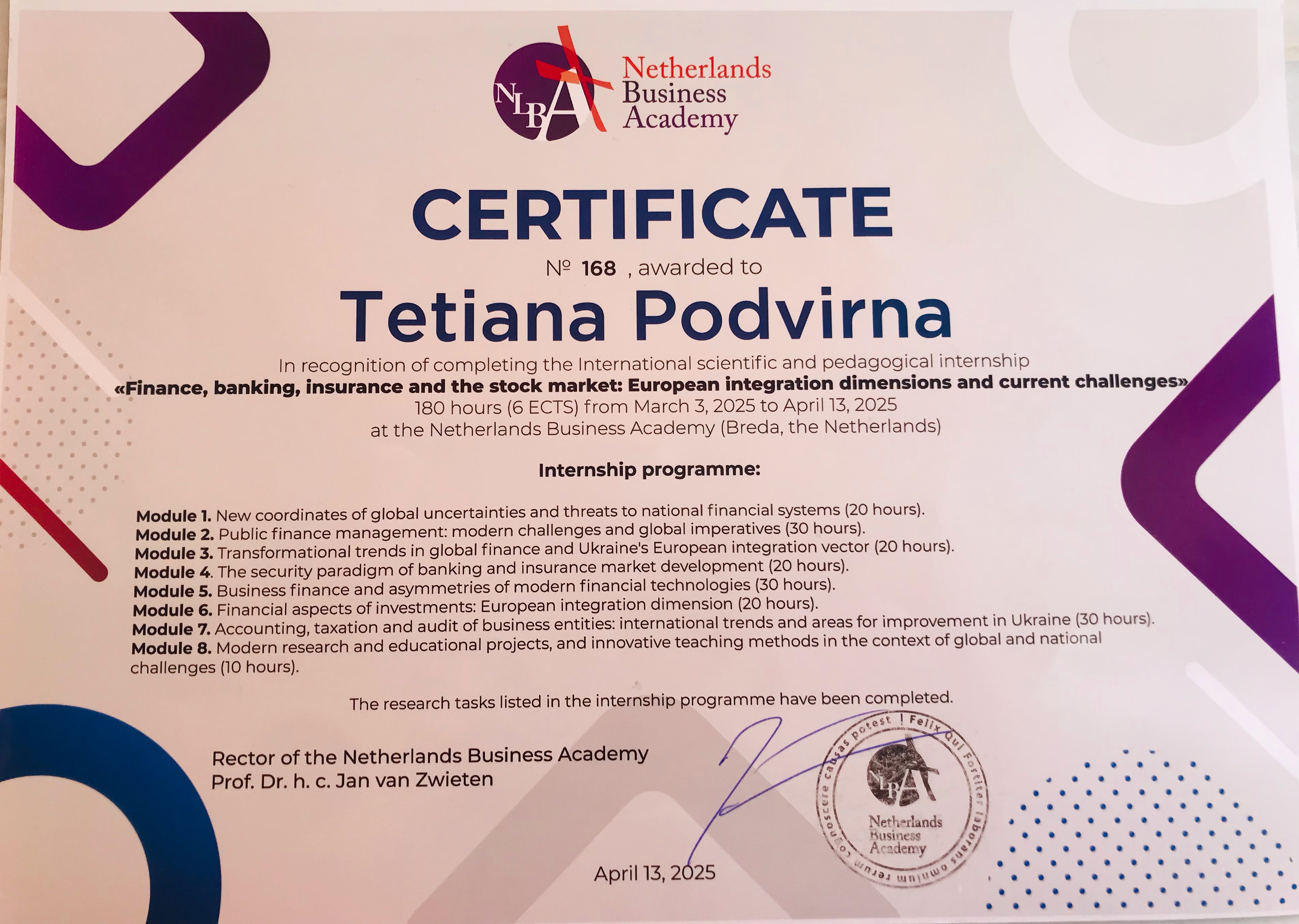 Міжнародне науково-педагогічне стажування «Finance, banking, insurance and the stock market: European integration dimensions and current challenges» Нідерландська академія бізнесу (м. Бреда, Нідерланди), ЗУНУ термін 03.03.2025 – 13.04.2025 р., 180 год, 6 кредитів ECTS (Сертифікат №168 від 13.04.2025).