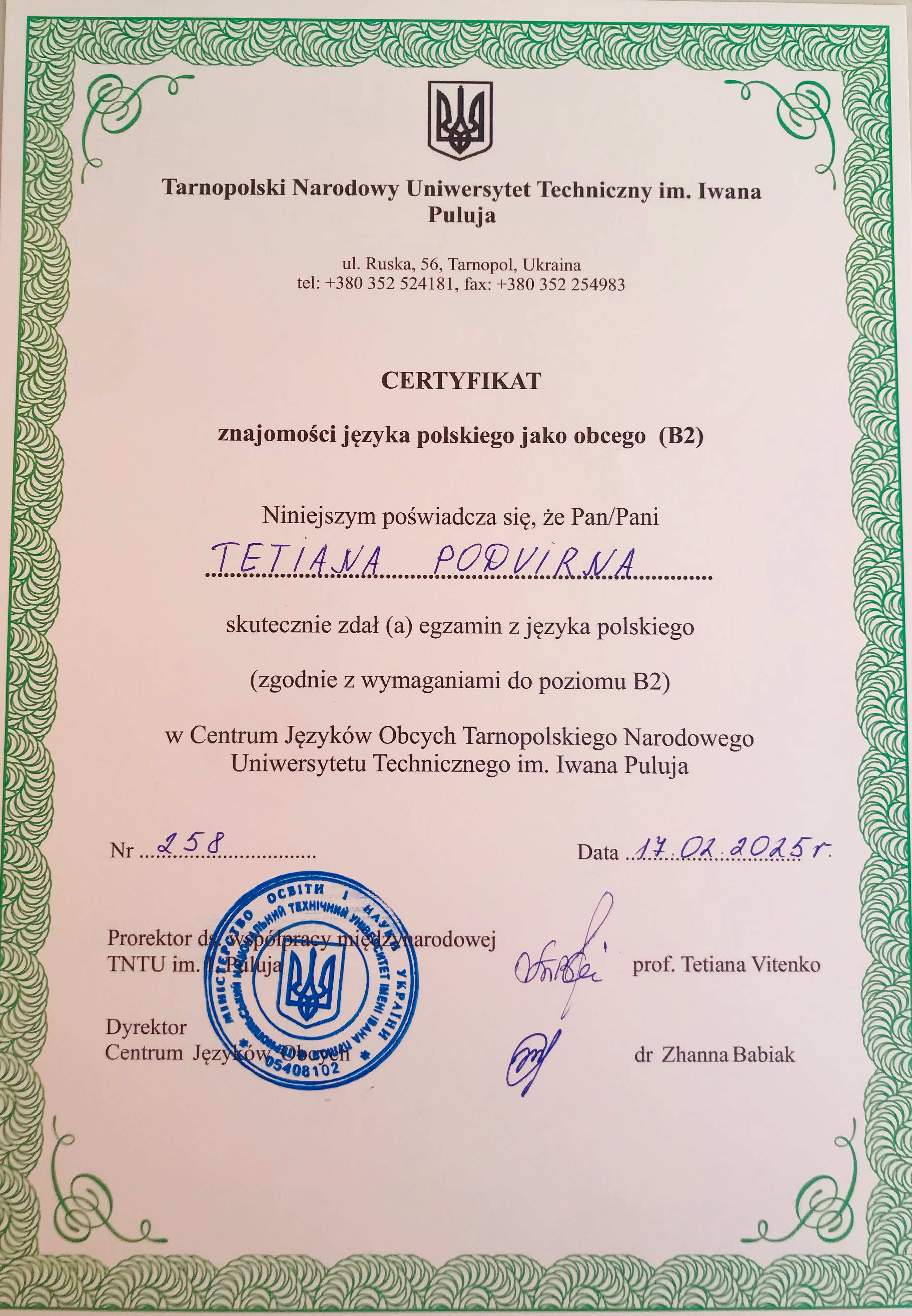 Польська (сертифікат про рівень володіння польською мовою на рівні В2 (2025р., ТНТУ)