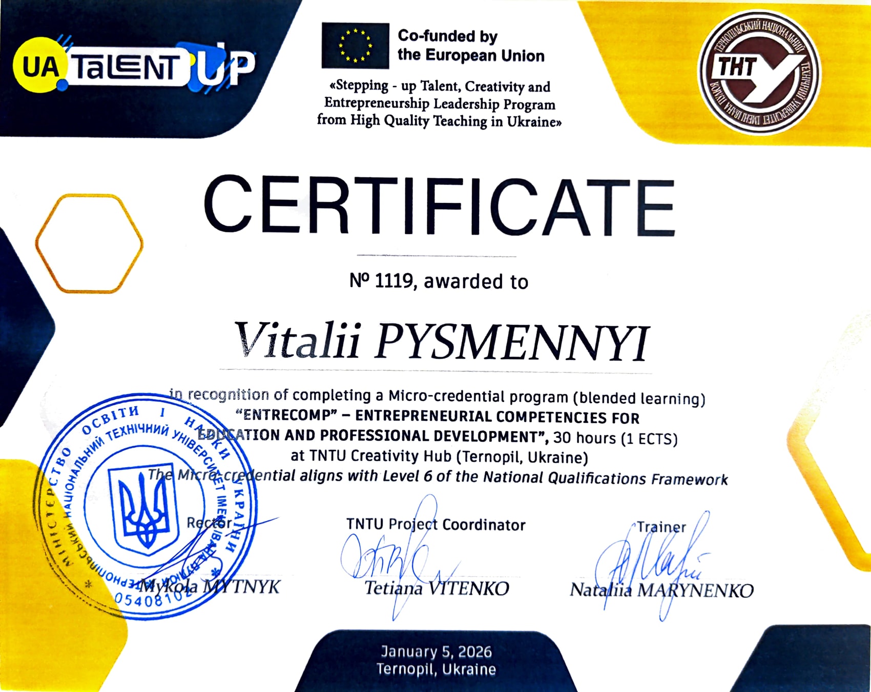 Департамент фінансів Тернопільської обласної державної адміністрації (тема: «Розвиток бюджетної політики у контексті сучасних суспільних викликів», 2021 р., 6 кредитів ЄКТС/180 год.).